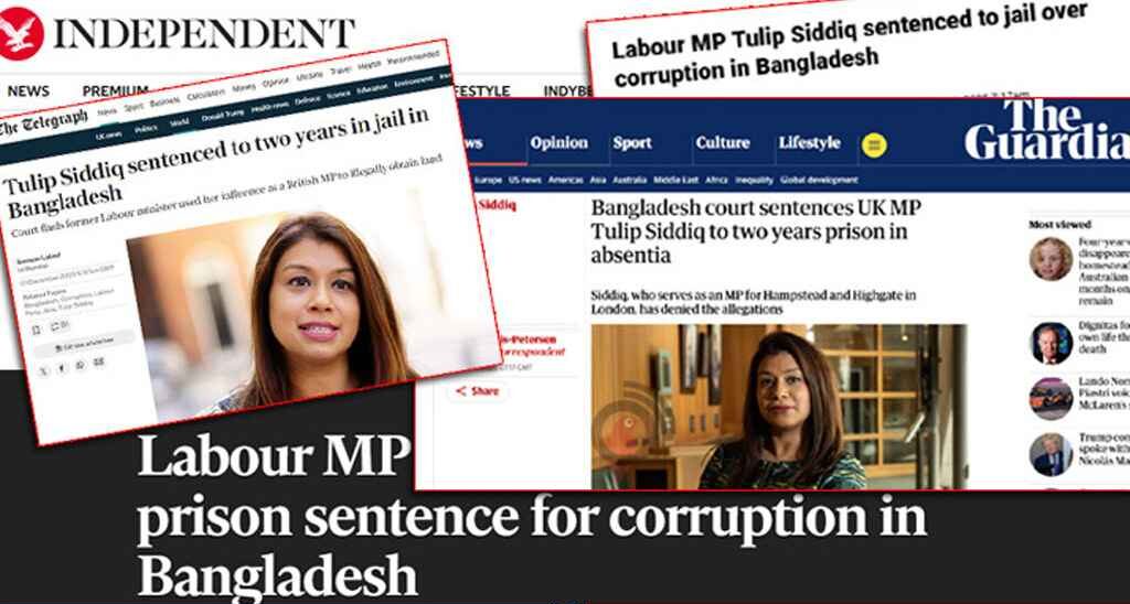 এলবিসি লিখেছে, ‘Labour MP Tulip Siddiq sentenced to two years in prison following corruption trial in Banglades ‘ (লেবার পার্টির এমপি টিউলিপ সিদ্দিককে বাংলাদেশে দুর্নীতির বিচারে দুই বছরের কারাদণ্ড দেওয়া হয়েছে)।