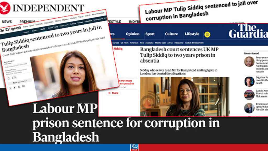 দ্য টেলিগ্রাফ লিখেছে, ‘Tulip Siddiq jailed for two years over corruption in Bangladesh’ (বাংলাদেশে দুর্নীতির অভিযোগে টিউলিপ সিদ্দিককে দুই বছরের কারাদণ্ড)।